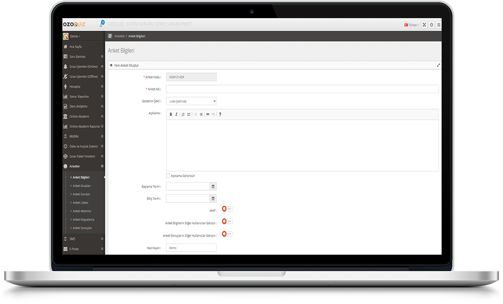 Ozoquiz Anket modülü ile sistemde kayıtlı üye hesaplarına (öğrenci, personel, bayi) ihtiyaç duyulan veriyi elde etmek amacıyla gerekli anketler kolayca yapılabilinir.